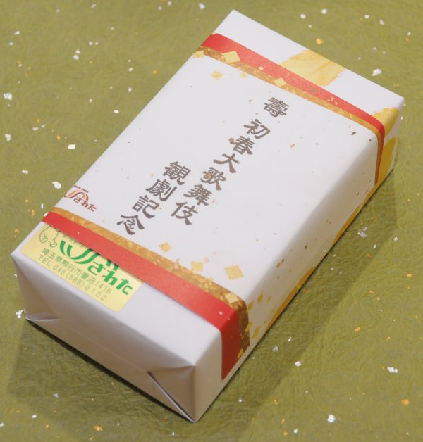 昼の部『実盛物語』より、実盛公ゆかりの地・熊谷の妻沼聖天山から妻沼(めぬま)の和菓子店・沢田本店より、埼玉県の木「けやき」の葉をかたどった「むさし野の﨔(6枚箱入)」。