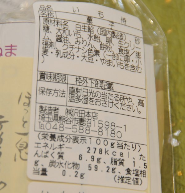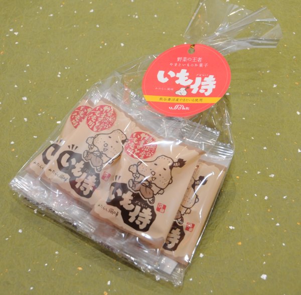 昼の部『実盛物語』より、実盛公ゆかりの地・熊谷の妻沼聖天山から妻沼(めぬま)の和菓子店・沢田本店より、「いも侍(5個入)」。