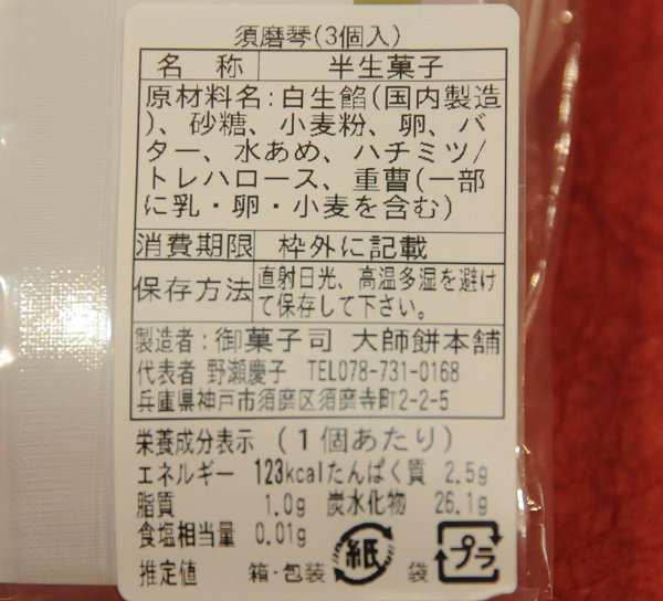『一谷嫩軍記』ゆかりの地・神戸市・須磨区より、大師餅本舗「須磨琴(3個入)」。